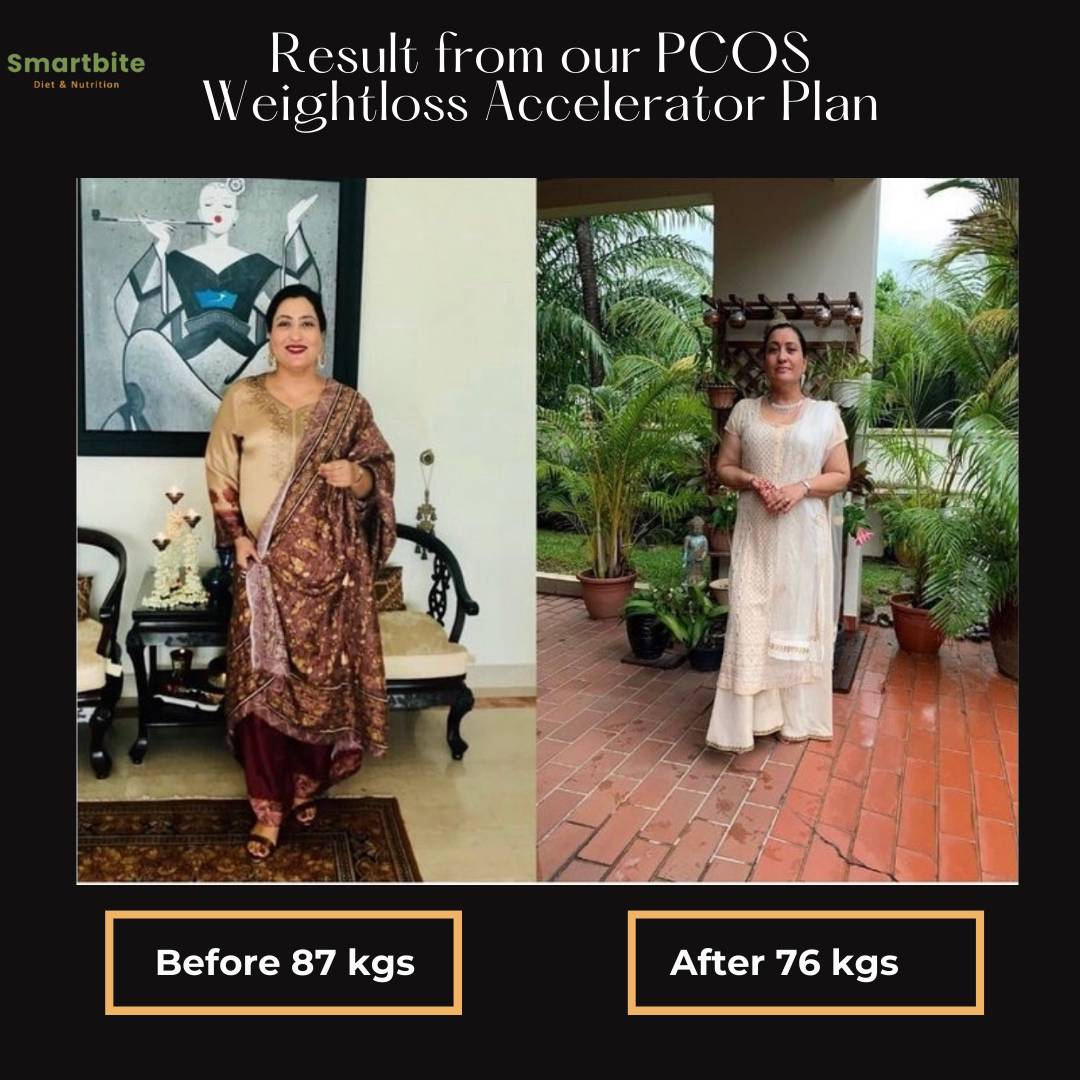 This transformation is of my client Pooja. When she joined me, she was struggling with PCOS along with multiple symptoms like acid reflux, bloating, irregular periods, hormonal imbalance, and joint pain. She had tried many things for weight reduction but nothing worked. Her goal was sustainable weight loss , not crash dieting. With the right nutrition and a balanced approach, she reduced her symptoms significantly and went from 86 kg to 76 kg within her target duration. Along with weight loss, she regained her stamina, improved joint health and now feels more energetic and confident in her body.